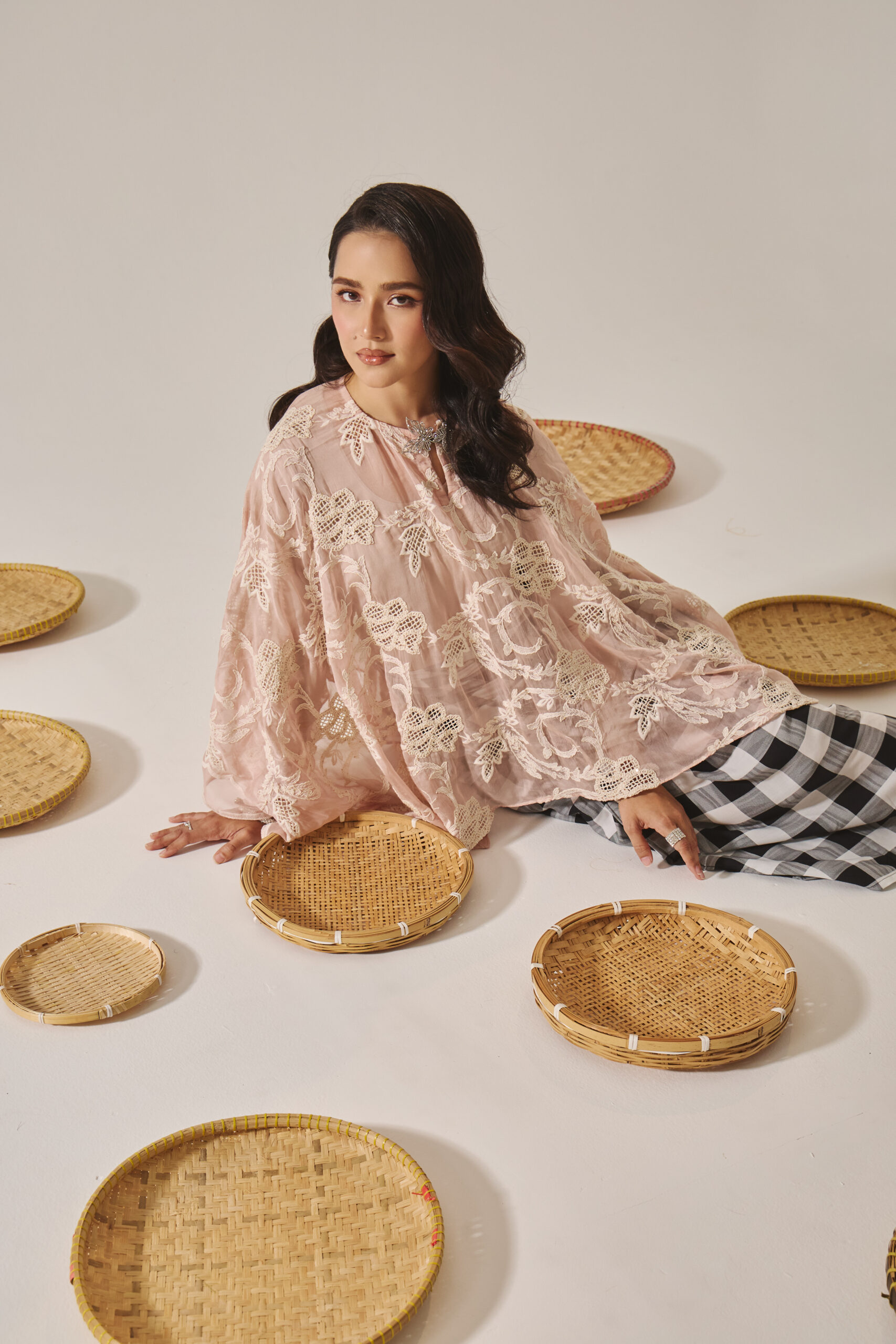 Designed with a flowing kurung cut that drapes effortlessly, the ensemble radiates grace and quiet sophistication. Its romantic structure and artisanal detailing make it a piece that feels both nostalgic and modern — a celebration of heritage worn with pride.